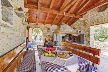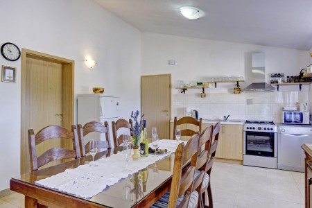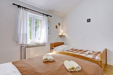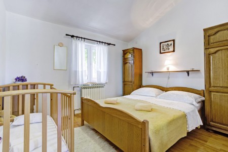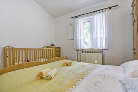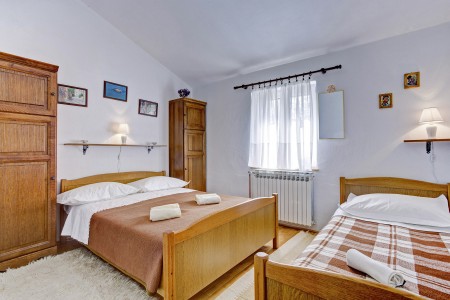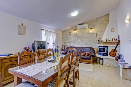 Kuća za 5-7 osoba: kuća površine ca. 80 m². Jedna dvokrevetna soba s dodatnim krevetom za jednu osobu, još jedna dvokrevetna soba, kupaona (tuš/WC), dnevni boravak u kojem je kauč na razvlačenje (širine 150 cm, dužine 180 cm) te stol za objedovanje, kuhinja, klima uređaj i kamin. Natkrivena ljetna terasa s roštiljem, plinskim štednjakom i sudoperom, stolom za objedovanje i prekrasnim pogledom na svjetlucavo more u daljini.