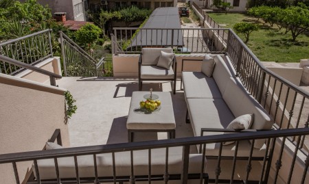 Kuća za 7-8 osoba: ca. 172 m², na tri etaže. U prizemlju se nalazi prostorija sa spravama za fitness, sauna te kupaonica (tuš/WC). Prizemlje i prvi kat nisu povezani unutarnjim stepenicama. Na prvom katu nalaze se dvije spavaće sobe, svaka s bračnim krevetom i vlastitom kupaonicom (tuš/WC). Jedna je soba klimatizirana, dok je druga dodatno opremljena SAT-TV-om, malim blagovaonskim stolom, čajnom kuhinjom i izlazom na balkon. Na ovoj etaži nalazi se i odvojeni WC s perilicom rublja. Na drugom katu nalaze se još dvije spavaće sobe. Jedna je opremljena bračnim krevetom i klima uređajem, dok druga ima jedan krevet za jednu osobu te dodatni pomoćni ležaj (80 × 200 cm) za još jednu osobu. Također se na ovoj etaži nalazi kupaonica (tuš/WC). Ovdje se nalazi i potpuno opremljena kuhinja s blagovaonicom i dnevnim boravkom s klima uređajem te izlaz na balkon opremljen sjedećom garniturom.