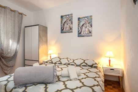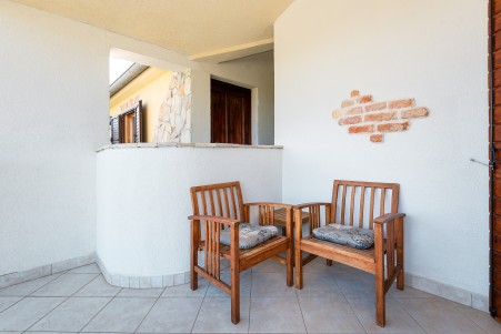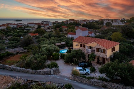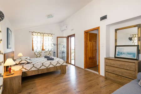 Kuća za 16 osoba: ca. 250 m², na dvije etaže. U prizemlju se nalazi potpuno opremljena kuhinja s dnevnim boravkom i blagovaonicom s klima uređajem, dvije spavaće sobe, svaka s bračnim krevetom, te jedna kupaonica (tuš/WC). Također se u prizemlju, sa zasebnim ulazom, nalazi još jedna spavaća soba s bračnim krevetom i klima uređajem te kupaonica (tuš/WC). Vanjsko stubište vodi na prvi kat, gdje se nalaze tri stambene jedinice, svaka sa zasebnim ulazom. Prva jedinica sastoji se od apartmana s dvije spavaće sobe, svaka s bračnim krevetom, manjeg dnevnog prostora s kuhinjskom nišom i klima uređajem te kupaonice (tuš/WC). Druga jedinica raspolaže dvjema spavaćim sobama, svaka s bračnim krevetom, povezane otvorenim prolazom, klima uređajem te kupaonicom (tuš/WC). Treća jedinica sastoji se od spavaće sobe s bračnim krevetom, manjeg kauča, klima uređaja, izlaza na balkon te kupaonice (tuš/WC).