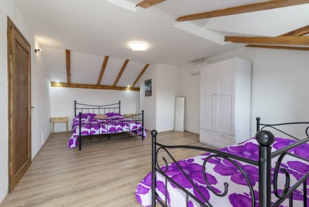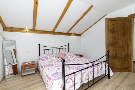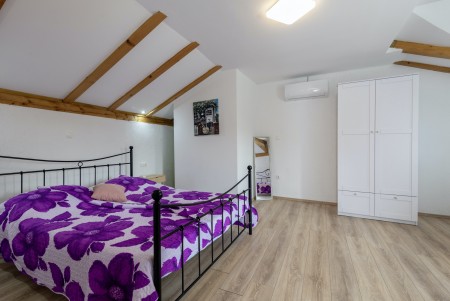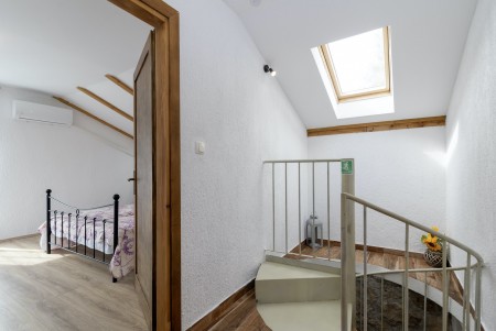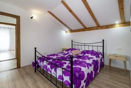 Kuća za 4-6 osoba: kuća površine ca. 90 m², podijeljena na dva kata. U prizemlju se nalazi udoban dnevno/blagovaonski prostor s kaminom i modernom, potpuno opremljenom kuhinjom. Također, tu je i WC. Spiralne stepenice vode na prvi kat gdje su smještene dvije spavaće sobe, svaka s bračnim krevetom i jednim dodatnim krevetom za jednu osobu, te kupaonica (tuš/WC). Obje spavaće sobe opremljene su klima uređajem te svaka ima veliki balkon s pogledom na zelenilo.