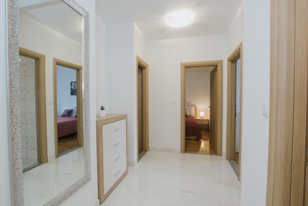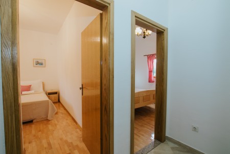 Kuća za 9 osoba: ca. 239 m², na dvije etaže. U prizemlju se nalazi kompletno opremljena kuhinja s dnevnim boravkom/blagovaonicom i klima uređajem. Nadalje, tu su i dvije udobne spavaće sobe s bračnim krevetima te kupaonica (tuš/WC). Stepenice vode na gornji kat, gdje se nalazi glavni prostor ove ville. Ovdje ćete pronaći otvoreni dnevni boravak s kaučem, stolom i stolicama za blagovanje te još jednom kompletno opremljenom kuhinjom. Prostor je klimatiziran i ima izlaz na balkon s pogledom na zelenilo i okolinu. Na ovoj etaži nalaze se još tri spavaće sobe: dvije s bračnim krevetima, od kojih jedna ima izlaz na balkon, te jedna s krevetom za jednu osobu i izlazom na balkon. Također, tu su i kupaonica (tuš/WC), kao i odvojeni WC.