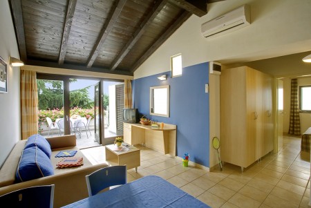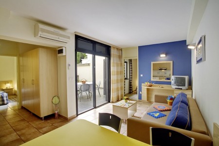 Apartman tipa A za 2-4 osobe: otprilike 38 m², sa klima uređajem, SAT-TV-om, telefonom i sefom, jednom dvokrevetnom sobom, dnevnim boravkom s kaučem na razvlačenje, kuhinjom s električnim štednjakom, mikrovalnom pećnicom, aparatom za filter kavu i perilicom za posuđe, blagovaonicom, tušem/WC-om, terasom (otprilike 15 m²). Moguća postavljanje dječjeg kreveta na zahtjev (uz nadoplatu, 5 € po danu).