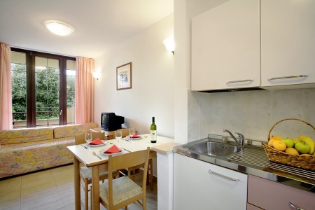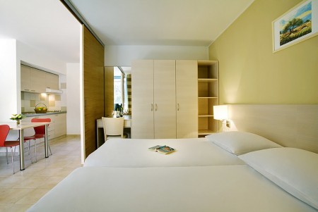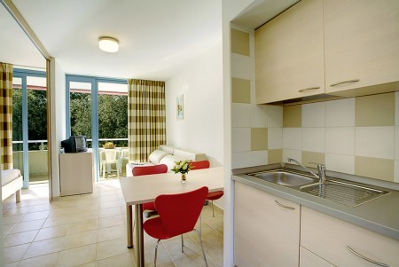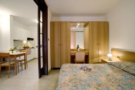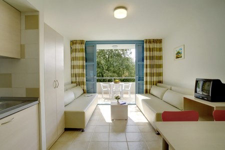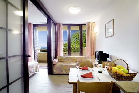 Standardni apartman za 2-4 osobe: otprilike 44 m², dvokrevetna soba, dnevni boravak s dva ležaja, SAT-TV, kuhinjska niša (odvojena od dnevnog boravka policom) i blagovaonica, tuš/WC, balkon s pogledom na more.