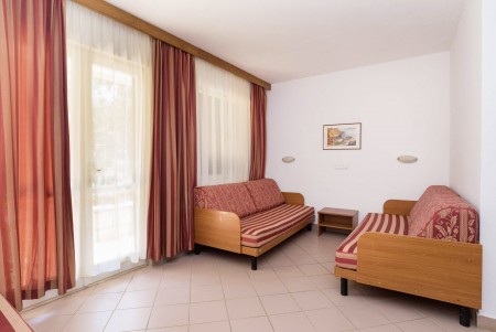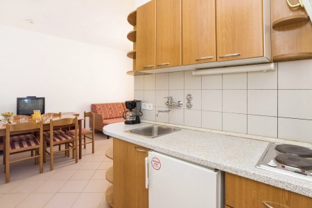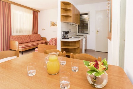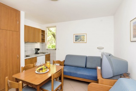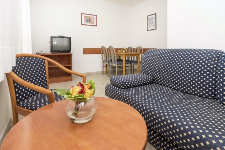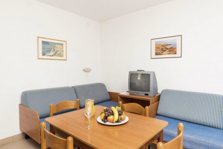 Apartman za 2-4 osobe: približno 30 m², dvokrevetna soba s dva pojedinačna kreveta, dnevno-spavaća soba s bračnim kaučem na razvlačenje, SAT-TV, telefon, kuhinjica i blagovaonica, kupaonica/WC i balkon ili terasa.