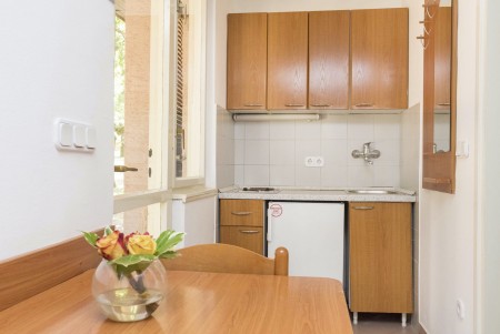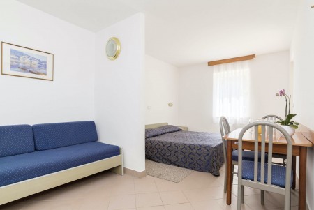 Studio za 2-3 osobe: približno 27 m², dnevno-spavaća soba s bračnim krevetom ili dva pojedinačna kreveta te kaučem na razvlačenje, SAT-TV, telefon, kuhinjica i blagovaonica, kupaonica/WC i balkon ili terasa.