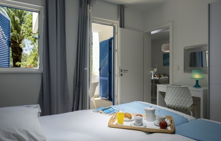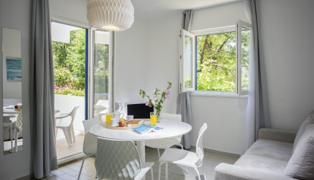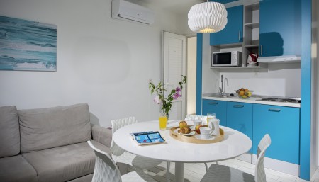Apartman za 2-4 osobe: cca 38 m², renoviran i moderno uređen, jedna dvokrevetna soba s dva odvojena kreveta, dnevni boravak s mini-kuhinjom, blagovaonicom i kaučem na razvlačenje, klima-uređaj, SAT-TV, telefon, WiFi internet (besplatno), tuš/WC, terasa ili balkon. Mogućnost besplatnog krevetića za bebe na upit.