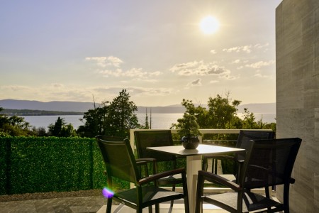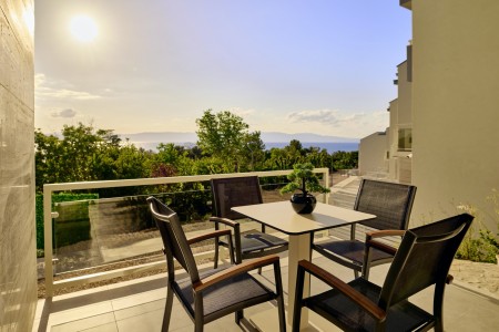 Apartman s terasom za 2-4 osobe: oko 38 m², spavaća soba s bračnim krevetom (160 x 200 cm), odvojeni dnevni boravak s mogućnošću spavanja za još 2 osobe na razvlačenju kauča (160 x 200 cm), kuhinja (hladnjak s ledenicom, perilica suđa, pećnica, električni štednjak i aparat za kavu), blagovaonica za 4 osobe, kupaonica s walk-in tušem i WC-om, sušilo za kosu, klima uređaj, SAT-TV, sef, telefon, high speed WiFi (besplatno) i perilica rublja. Apartman se nalazi u prizemlju i ima namještenu terasu (oko 10 m²) sa pristupom na promenadu objekta.