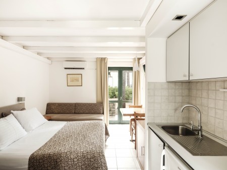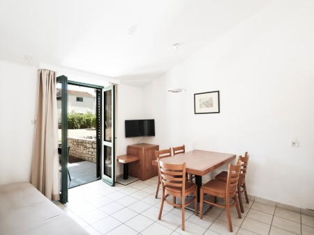 Studio "Essential" za 2-3 osobe: cca. 20 m² u prizemlju, prostor za boravak i spavanje s bračnim kaučem na razvlačenje (140x190 cm) i jednostruki kauč na razvlačenje (75x195 cm), kuhinjska niša i prostor za jelo, tuš/WC, terasa.