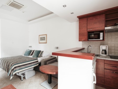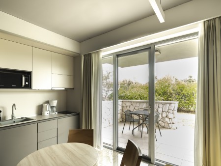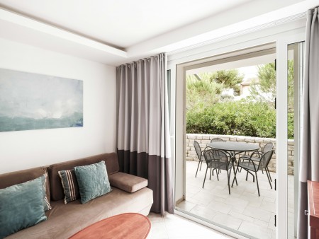 Studio "Superior" za 2 osobe: otprilike 29 m², moderno opremljen, u prizemlju, dnevni boravak sa sofom za spavanje za dvije osobe (160x200 cm), kuhinjski blok i blagovaonica, tuš/WC, terasa.