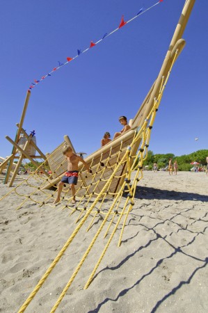Plaža: Do 2.000 m dugog pješčano-šljunčane plaže - uglavnom s pješčanim morskim dnom i vrlo blago padajućom, stoga idealnom za malu djecu - ovisno o smještaju udaljenost je otprilike 50 do 950 m. Najam ležaljki i suncobrana, snack bar i tobogan za vodu.