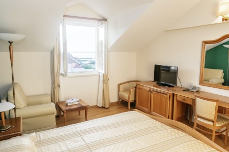 Trokrevetna soba: otprilike 27 m², veliki bračni krevet (180 x 200 cm), dodatni krevet (120 x 200 cm), također dostupno s balkonom s pogledom na otok.
