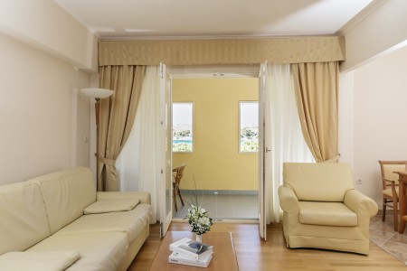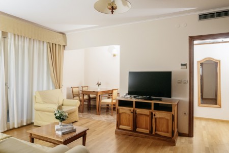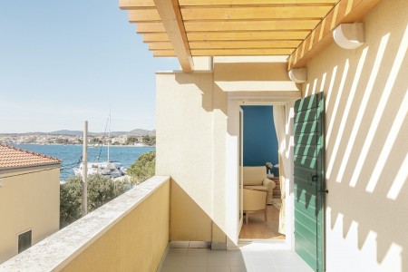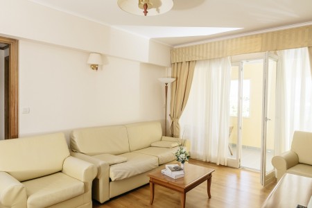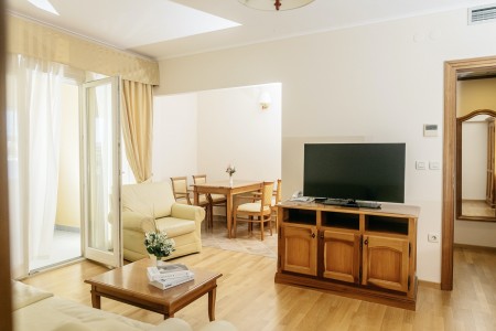 Suite: otprilike 59 m², bračni krevet (180 x 200 cm), odvojeni dnevni boravak s blagovaonskom površinom i sofom na razvlačenje sa spavaćim mjestom za još 2 osobe (160 x 200 cm), balkon ili terasa s pogledom na more