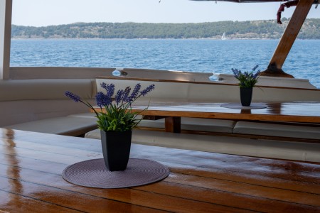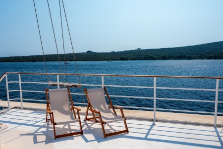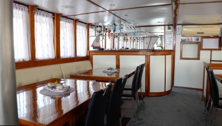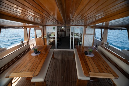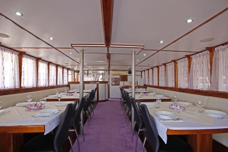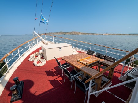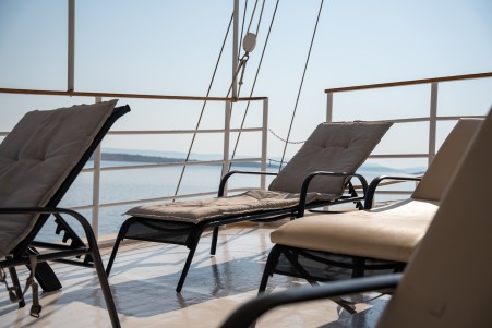 Ostalo: Paluba za sunčanje (150 m²) sa 37 ležaljki, stolovi sa klupama za cca. 10 osoba na gornjoj palubi. Klimatizirani salon za 37 osoba, stolovi sa klupama za cca. 24 osobe u natkrivenom dijelu glavne palube iza salona, koji se ovisno o vremenu može zatvoriti ceradama.