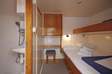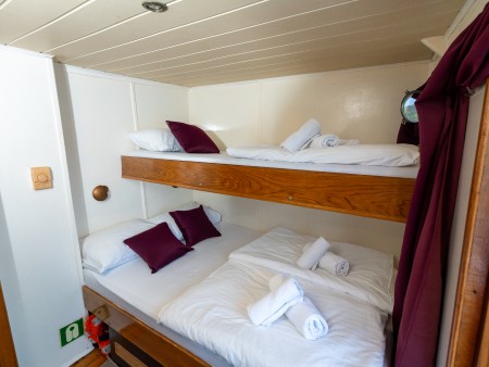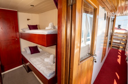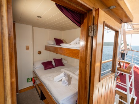 Gornja paluba: 2 dvokrevetne kabine s odvojenim krevetima, 4 kabine s francuskim ležajem (140 cm širine), 2 trokrevetne kabine s francuskim ležajem (130 cm širine) i trećim krevetom iznad, 2 trokrevetne kabine s francuskim ležajem (140 cm širine) i trećim krevetom iznad.