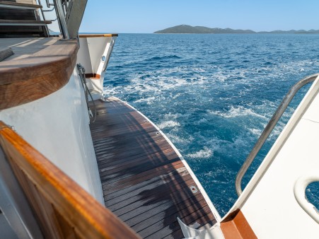 Ostalo: Paluba za sunčanje (200 m²) sa 26 ležaljki, stolovi sa klupama za 30 osobe na palubi, platforma za kupanje i vanjski tuševi na krmi, klimatizirani salon za 30 osobe.