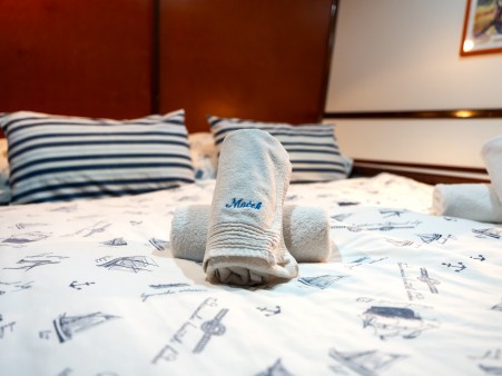 Gornja paluba: 3 kabine s francuskim ležajem, 1 dvokrevetna kabina s odvojenim krevetima.