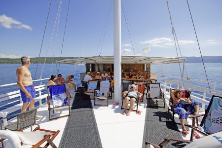 Ostalo: Paluba za sunčanje (150 m²) s 20 ležaljki, novi lounge prostor za 10 osoba na gornjoj palubi ispred kormilarnice kao i na krmi gornje palube za 8 osoba, stolice i klupe na palubi, salon s klima uređajem za 32 osoba.
