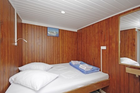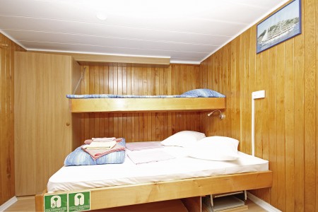 Gornja paluba: 4 kabine s francuskim ležajem, 3 dvokrevetne kabine s krevetima na kat.