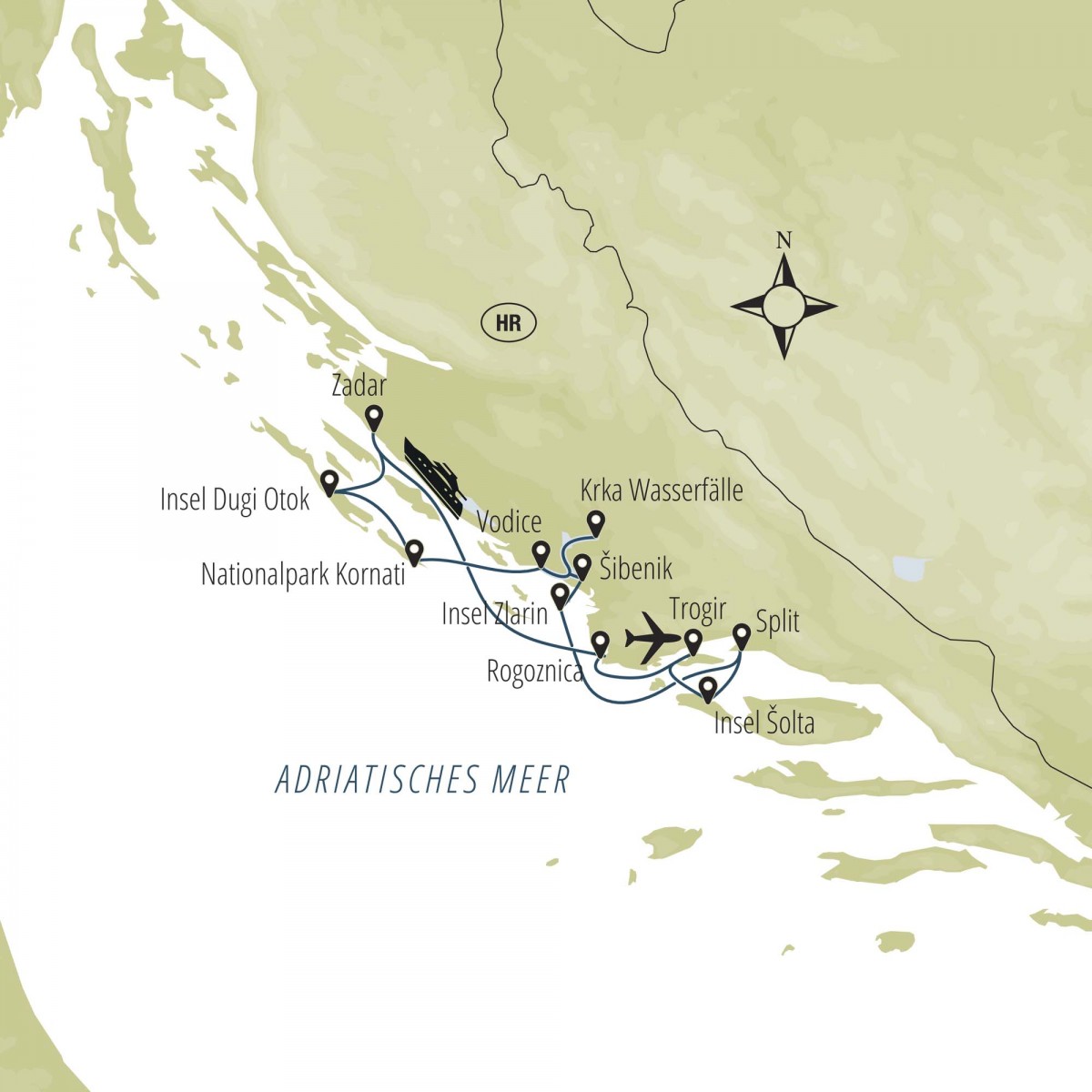 Trogir – Rogoznica – Zadar – Dugi Otok – Nacionalni park Kornati – Vodice – slapovi Krke – Šibenik – otok Zlarin – Split – otok Šolta – Trogir