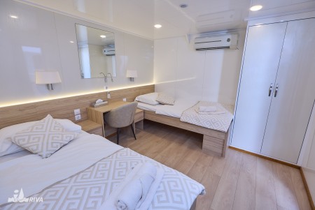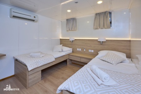 Potpalublje: 4 dvokrevetne kabine s odvojenim ležajima, 2 kabine s francuskim ležajem, 2 trokrevetne kabine s francuskim ležajem i trećim krevetom pored.