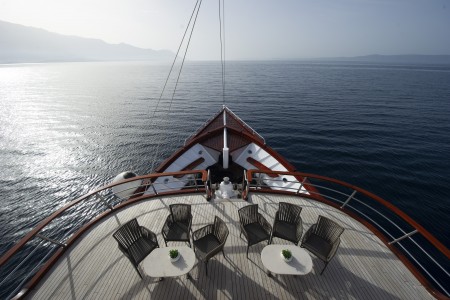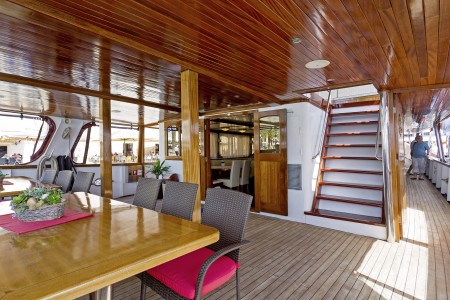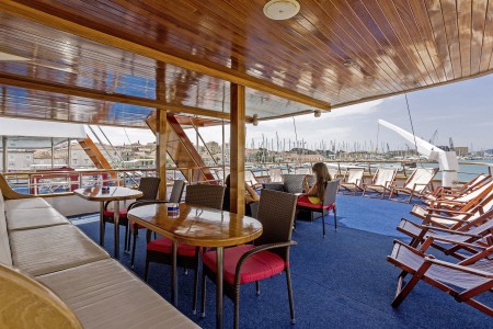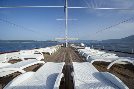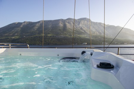 Ostalo: Sunčana paluba (280 m²) s tendom na uvlačenje, 45 ležaljki i jacuzzi, stolovi s klupama iza salona na glavnoj palubi za oko 20 osoba, udobne sjedeće garniture u prostoru na natkrivenoj gornjoj palubi, koji se ovisno o vremenskim prilikama može zatvoriti zaštitom od sunca ili ceradama. Platforma za kupanje s tuševima na krmi, salon s klimom za 40 osoba.