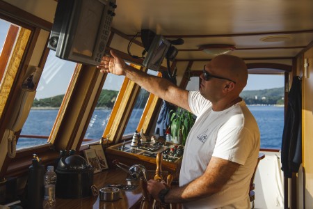 Naravno, ne plovim prema fiksno utvrđenoj ruti već gostima dajem priliku da izraze želju što bi voljeli posjetiti. Međutim, u pravilu izbjegavam noćenja na kopnu jer je na otocima mnogo mirnije. Na Braču volim ugodno malo ribarsko mjesto Postira u čijoj smo luci ponekad jedini brod. Ili u Mlinima, mirnom naselju koje leži duboko u zaklonjenoj uvali. Zatim, obično je na rasporedu otok Hvar. Dok je hvarska luka često pristanište za čak 30 brodova koji ovdje istovremeno noće, ja biram manja mjesta kao što su Jelsa i Vrboska na sjevernoj strani otoka. Ta su mjesta uvelike zadržala svoju izvornost i za razliku od Hvara, ovdje nema glasne glazbe koja odzvanja iz lokala sve do jutra. Nadalje, ovdje je takozvani „zabranjeni otok“ Vis. Otok je bio vojno područje s ograničenim pristupom sve do kraja osamdesetih godina, a strancima je bio potpuno zabranjen pristup. Zbog toga se masovni turizam ovdje nije razvio. Idućeg dana moje prvo odredište na otoku obično je grad Vis, s tipičnom mediteranskom ljetnom vrevom, zatim se zaustavljamo u gradiću Komiži na suprotnoj strani otoka. Budući da smo na Komiži, nećemo propustiti obližnji otočić Biševo na kojem moji gosti imaju priliku malim brodicama posjetiti čuvenu Modru špilju. Ističem da ovo nije fiksni program, već ovisi o željama mojih gostiju i naravno o vremenskim prilikama.