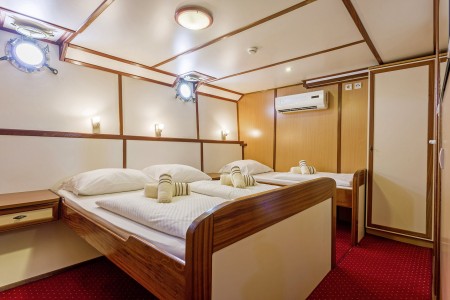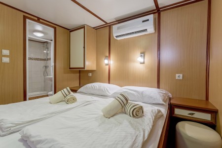 Potpalublje: 4 dvokrevetne kabine s odvojenim ležajima, 2 kabine s francuskim ležajem, 2 trokrevetne kabine s francuskim ležajem i trećim krevetom pored.