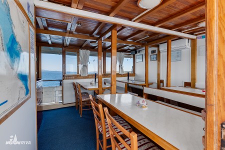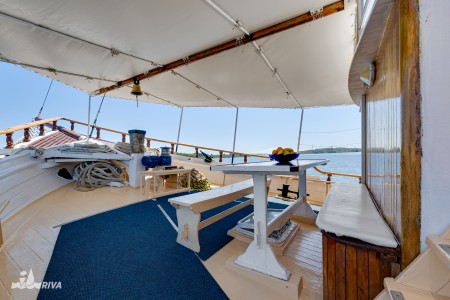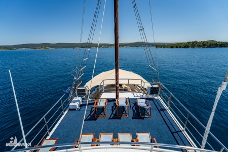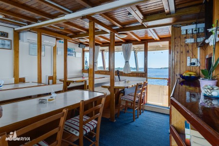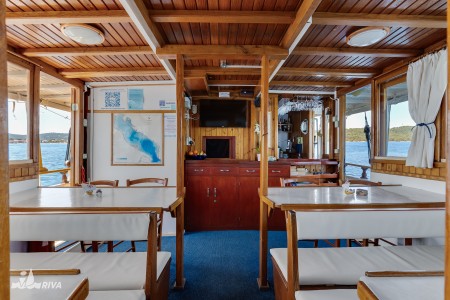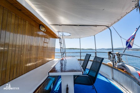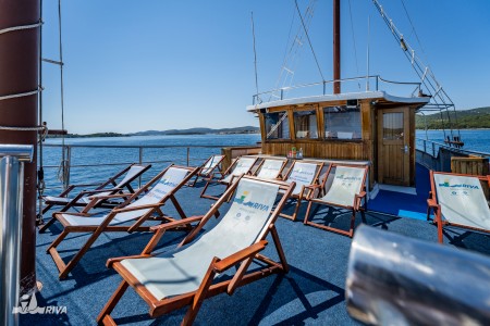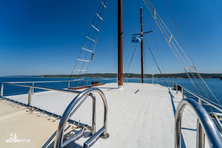 Ostalo: Paluba za sunčanje (60 m²) sa 11 ležaljki, stolovi sa klupama za 18 osoba na glavnoj palubi, klimatizirani salon za 20 osoba.