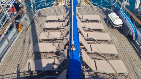 Ostalo: Paluba za sunčanje (100 m²) sa 18 ležaljki, stol sa klupama za cca. 14 osoba u natkrivenom dijelu glavne palube iza salona, klimatizirani salon za 18 osoba. 2 SUP-ovi (stand up paddle boards) su besplatno dostupna.
