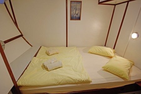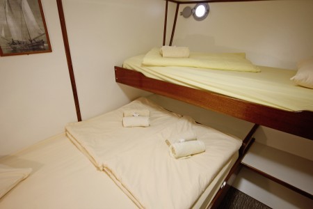 Potpalublje: 1 kabina s francuskim ležajem, 1 trokrevetna kabina s francuskim ležajem i trećim krevetom iznad, 2 dvokrevetne kabine s odvojenim ležajima.