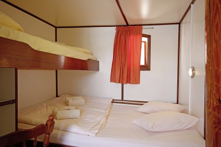 Gornja paluba: 1 kabina s francuskim ležajem, 1 trokrevetna kabina s francuskim ležajem i trećim krevetom iznad.